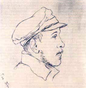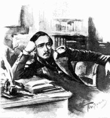 ![]() После валерикского боя, в палатке. Июль 1840. Рис. с натуры барона Д.П. Палена, однополчанина Лермонтова. Единственный профильный портрет поэта, возможно, наиболее схожий с оригиналом. |