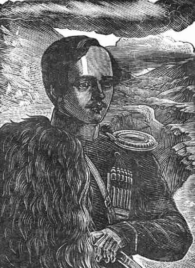 ![]() 1931. Гравюра худ. В.А. Фаворского. Поэт в расстегнутом сюртуке полулежит на бурке. Композиция глубоко психологична: душевное состояние Лермонтова подчеркнуто образами природы. |