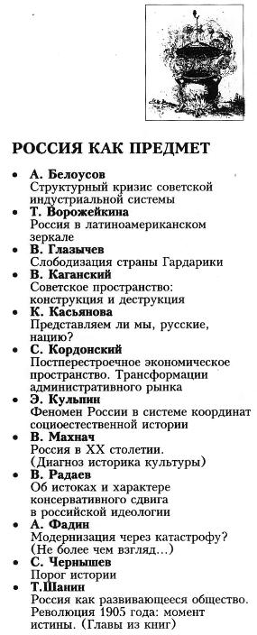| Что утвердилось после 91-го года в границах РСФСР – одной из республик большого Союза? Получило ли повторное возникновение России на карте мира культурный смысл в единой русской традиции? Ясен ли этот смысл тем, кем он должен быть воспринят? Найдется ли место для «малой России» в уме и языке русский? Приемлемо ли для них это место? И наконец, в кого превращается русский советский человек, вынужденный решать эти вопросы или, точней, приспосабливаться к их нерешенности? Не возник ли в мировой семье народов новый – «беловежский человек», отличный от ранее известного русского? | |